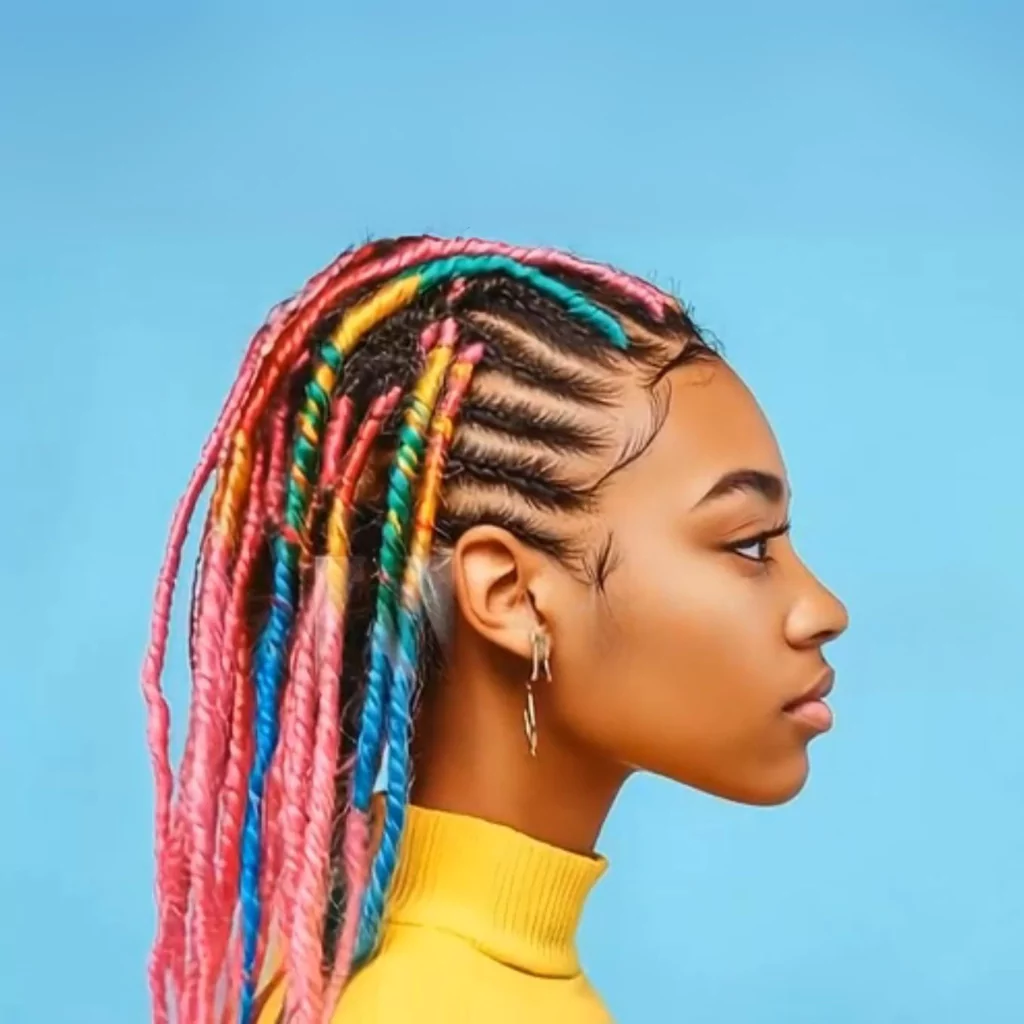 These styles are enhanced with colourful Feed-in Kanekalon (synthetic) hair extensions for volume, which has the ability to hold braids very well. Accessories like beads, glitter and floral accents to name a few can be added for extra drama!!